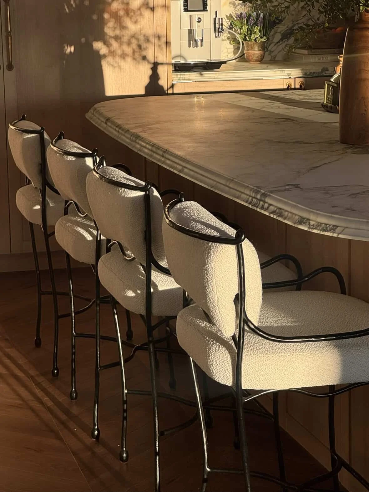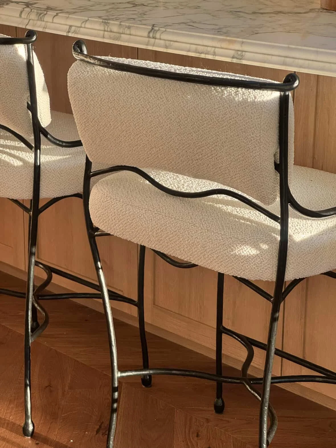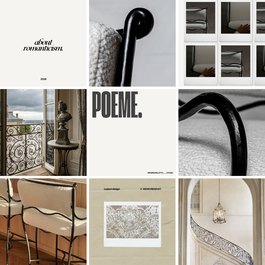 Crafted in wrought iron, boucle fabric, and curved details, the Poème stools celebrate artistry, memory, and modern femininity.